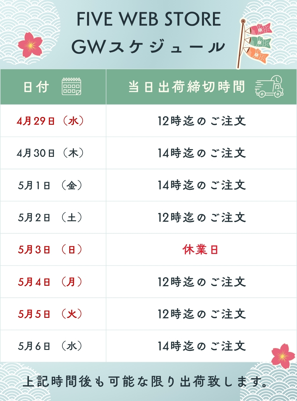 ゴールデンウィーク期間中もファイブウェブストアは通常通り発送業務を行います。