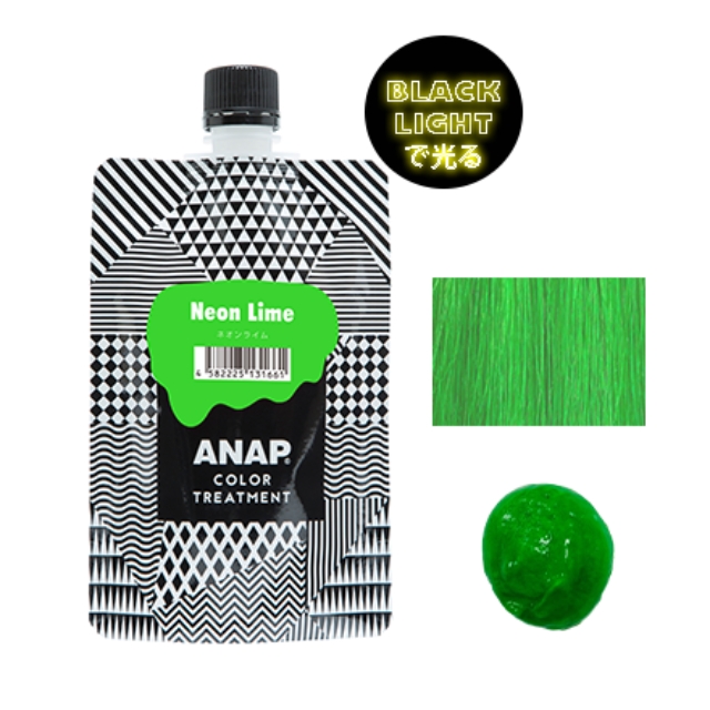 蛍光色のグリーン。クリアなグリーンで、アクセントカラーやインパクトのあるスタイルにおすすめです。ブラックライトで発光します。